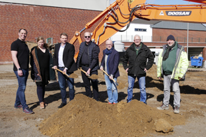 Gregor Born und Sinja Tomczyk vom ZBH, zusammen mit Stadtbaurat Christoph Heidenreich, ZBH Leiter Thomas Westerheider, Bürgermeister Fred Toplak und Bauleiter Martin Jäger (Firma AKS) sowie Vorarbeiter Ralf Saedler (AKS) beim obligatorischen ersten Spatenstich für den Bau eines neuen Wertstoffhofes.