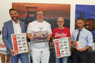 Herten ist jetzt eine Marke! Brief und Mehr Geschäftsführer Marco Morocutti, Fotograf Markus Messmann, Bürgermeister Fred Toplak und Ciro Lenti, Koordinator Briefmarken & Verkaufsstellen bei Brief und Mehr präsentieren die neuen Herten-Marken und die Sondermarke für die Extraschicht.