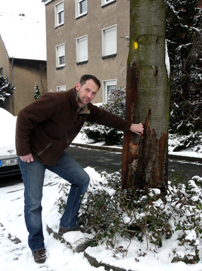 Lars Kuhnt, Baumsachverständiger beim ZBH, begutachtet eine erkrankte Kastanie in der Amtsstraße in Herten.