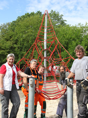v.li.: Susanne Rühl (ZBH Grün), Michael Rorowski und Dennis Köllner (beide ZBH Grün, Spielplatzkontrolle), Ernst Beltzig und Gottfried Krupinski (beide Firma Corocord) vor dem neuen Klettergerät.