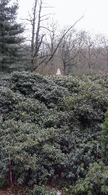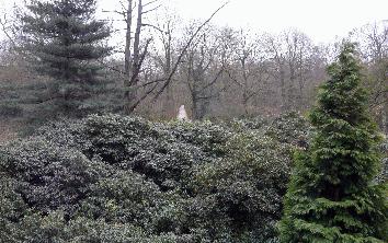 Der Blick aufs Tabakhaus wird in Höhe der Narzissenwiese noch durch einen großen Rhododendron verhindert, doch die Markierungen im Vordergrund zeigen, wo bald schon die Sichtachse verlaufen wird.