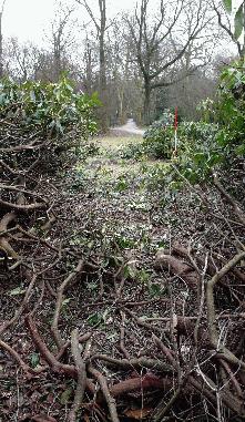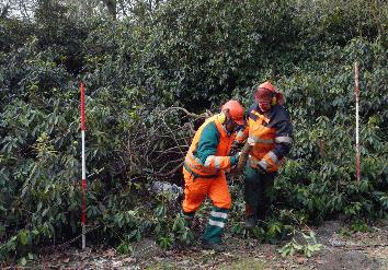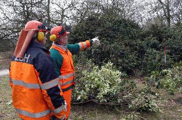 Der Anfang ist gemacht. Ludger Nöllenheidt hat mit der Kettensäge eine erste sichtbare Schneise in das Meer von Rhododendron gesägt.