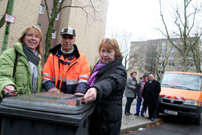 Rafale Taplik, ZBH-Bereichsleiterin Helene Langer, ZBH-Mitarbeiterin Vera Zimmermann und Peter Wolny begutachten die „blauen Tonnen“!