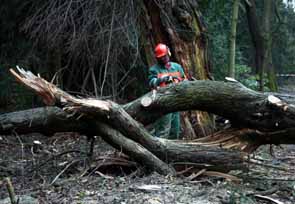 Mitarbeiter des ZBH beseitigen am frühen Freitagmorgen die Schäden, die Orkan Kyrill in der Nacht an Bäumen im Stadtgebiet angerichtet hat.