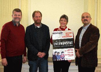 Laden zur Lesung ein (v.l.): Meinolf Remmert von der AWO-Integrationsagentur, Jens Keienburg von der Flüchtlingsberatung der Diakonie sowie Büchereileiterin Gudrun Völcker und Integrationsratsvorsitzender Ercan Atay.