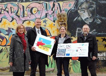 Stellten bei einem Pressetermin das “Siegerlogo” vor: (von li.) Projektleiterin Gabriele Bilke, Ressortleiter Olaf Pestl, Quartiersmanagerin Tabea Rössig und Volker Cznottka von der Abteilung Stadtentwicklung.