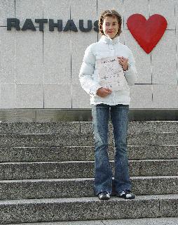 Bürgermeister Klaus Müller (mit Babysimulator), Vetreterinnen der Frauenunion Iserlohn, Lisa Deus und Melanie Kramm (Schülerinnen der 8 b der Realschule am Bömberg) mit ihrer Lehrerin Dorothee Winter-Lehmann, Friedhelm Kowalski (Ressortleiter Soziales, Jugend, Schule, Sport) und Dr. Ulrich Bildheim bei der Spendenübergabe im Iserlohner Rathaus