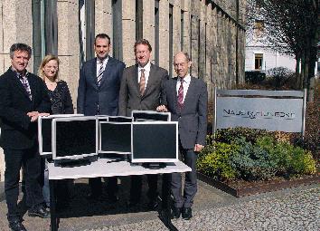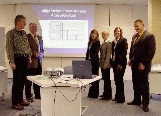 Hans-Georg Schreiber, Leiter der Bereiches Ausländerangelegenheiten, Klaus-Peter Knops, Leiter des Ressorts Sicherheit und Bürger (von li.) und die Studenten der Fachhochschule bei der Projektpräsentation im Iserlohner Rathaus.
