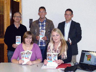 Stellten das Programm der diesjährigen Aktion “Kids und Kunst” im Iserlohner Rathaus vor: Bürgermeister Klaus Müller (Bildmitte) und Mitarbeiter des Kinder- und Jugendbüros. Mit dabei auch Kathrin Bodgoll und Anna Schnier von der Gestaltungsklasse des Berufskollegs Märkischer Kreis, die den Programm-Flyer entworfen hatten, mit ihrem Lehrer Holger Albertini.