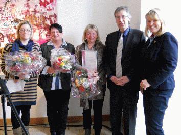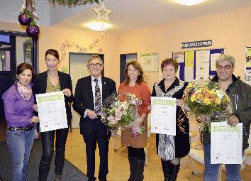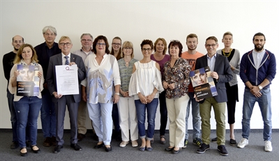Bürgermeister und Kulturressortleiter Dr. Peter Paul Ahrens (mit Urkunde) freute sich mit dem Team der VHS über die erneute Zertifizierung.