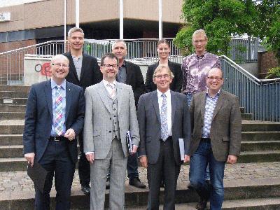 Erläuterten das weitere Vorgehen beim Projekt „a-BUS Iserlohn – New Mobility Lab“ (v.l.) Manuel Weniger, Christian Eichhorn, Reiner Timmreck, Thorsten Schick, Stefan Janning sowie Prof. Dr.-Ing. Ulf Witkowksi und Prof. Dr.-Ing. Andreas Nevoigt.