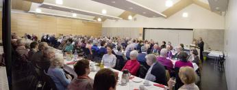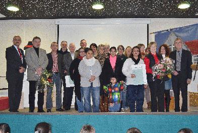 Die hauptamtliche “Continue”-Koordinatorin Brigitte Manthey-Radzuweit (stehend, l.) sowie Hotel Korth-Inhaber Markus Bürger (stehend, 2.v.l.) und sein Team freuten sich über zahlreiche Gäste bei der diesjährigen “Continue”-Jahresabschlussfeier im Forum des Stenner-Gymnasiums.