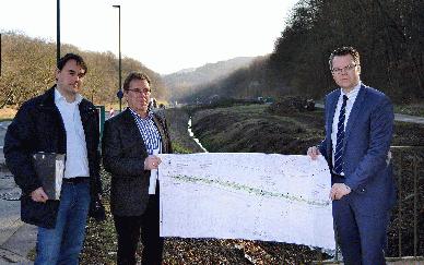 Mike Janke, Leiter des städtischen Ressorts Planen, Bauen, Umwelt- und Klimaschutz, Rüdiger Klincke vom Bereich Stadtbauwesen und Kai Höffken von der Abteilung Stadtentwässerung (v.r.) erläuterten den ersten Bauabschnitt bei der Renaturierung des Schapker Baches.