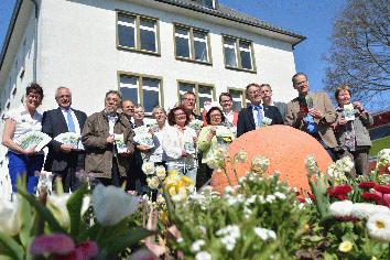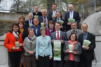 Die stellvertretende Bürgermeisterin Eva Kirchhoff (4.v.l.) und Patricia White von der städtischen Abteilung Umwelt- und Klimaschutz (3.v.r.) werben gemeinsam mit Amtskollegen und weiteren Mitgliedern des Arbeitskreises „Offene Gärten im Ruhrbogen“ für die diesjährige „Gartensaison“ (Foto: © Stadt Arnsberg).