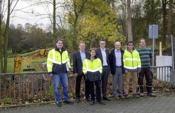 Bei einem Pressegespräch auf der Baustelle wurde der 2. Bauabschnitt zur Renaturierung des Schapker Baches erläutert (v.l.): Kai Höffken, Rüdiger Klincke und Nicole Neuhoff vom Bereich Stadtbauwesen, Bauressortleiter Maik Janke, Andreas Rings vom Ingenieurbüro Dr. Sonnenburg sowie Peter Plaßwilm und Burkhard Mai von der Firma Sauer & Sommer.