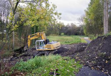Bereits Ende vergangener Woche startete der 2. Bauabschnitt. Dort, wo der Schapker Bach künftig in den Baarbach einmünden wird, begannen die Erdarbeiten.