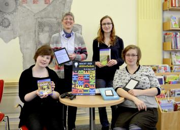 Gemeinsam mit den Auszubildenden Marina Deerberg (l.) und Stephanie Merschhoff (r.) präsentiert die stellvertretende Büchereileiterin Gudrun Völcker das umfangreiche neue Sach-DVD-Angebot der Iserlohner Stadtbücherei.