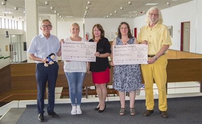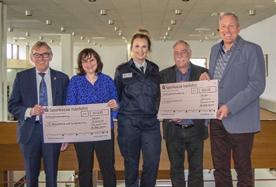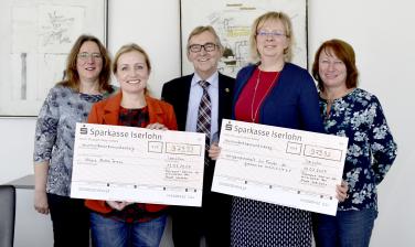 Bei einem Pressetermin im Iserlohner Rathaus wurden die symbolischen Spenden-Schecks übergeben an Julia Hegemann (2.v.l.) und Martin Brunswicker (r.).