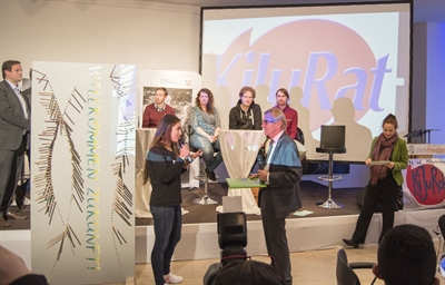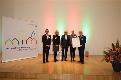Bei der Auszeichnung im Düsseldorfer Museum Kunstpalast (v.l.): Staatssekretär Dr. Marc Jan Eumann, Frank Finkeldei vom städtischen Ressort Generationen und Bildung, Dr. Stephan Koppelberg, Leiter der Vertretung der Europäischen Kommission in Bonn, Katja Michalski und Matthias Quaschnik, städtisches Europabüro, Bürgermeister Dr. Peter Paul Ahrens, Ministerpräsidentin Hannelore Kraft sowie Aart Jan de Geus, Vorsitzender der Bertelsmann Stiftung. Foto: Bernd Hegert