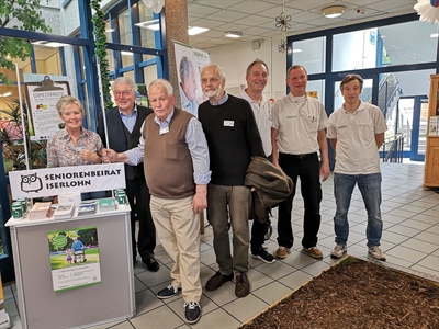 Über den richtigen Umgang mit dem Rollator informierten Christel Osing, Heribert Hahner, Joachim Pfänder und Dr. Norbert Hesse von Seniorenbeirat sowie Guido Moldenhauer, Frank Packheiser und Eckhard Warnke von BRANDvital (v.l.).