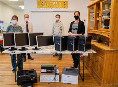 Übergabe der „Restcentspende“ an den Verein Strahlende Gesichter e.V. (v.l.): Claudio Porcu, Bürgermeister Michael Joithe sowie Ingrid Zöllner und Christoph Bühner vom Personalrat. Der zweite Spendenscheck wird dem Verein Gulliver for Kids e.V. zugestellt.