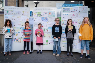 Claudia Lüno (Autorin), Petra Lamberts (Kinder- und Jugendbeauftragte), Ralf Paprotta (stellvertr. Vors. der LAG Jugend und Literatur NRW e.V.), Ulrich Pagenstecher (Leiter der Stadtbücherei), Katharina Ramb (Kinder- und Jugendarbeit der Stadt Iserlohn) und Bürgermeister Klaus Müller (v.l.n.r.) stellten das Projekt vor.