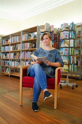 Die Leiterin der Letmather Zweigstelle Rahel Horschak lädt zum Besuch in der neu aufgestellten Bücherei und zu den kommenden Veranstaltungen im Kronleuchtersaal ein.