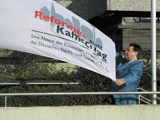 Bürgermeister Klaus Müller hisst die Protestflagge im Rahmen der Aktion "Städte in Not - Reformen statt Kahlschlag"