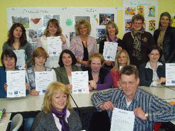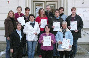 Dozenten und Teilnehmerinnen des Qualifizierungslehrganges der VHS Iserlohn bei der Übergabe des “Tagesmutter-Passes” Fotonachweis: Stadt Iserlohn