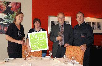 Der Inhaber des Hotels Korth Markus Bürger (links) sponserte zur Hälfe das Kaffeetrinken im Rahmen der diesjährigen “Continue”-Jahresabschlussfeier. Der stellvertretende Bürgermeister Harald Eufinger (3. v.r.) sowie die Mitarbeiter der Stadt Iserlohn Eckhardt Liesche, Brigitte Manthey-Radzuweit, Ute Tonat und Nicole Behlau (v.l.n.r.) dankten ihm dafür unter anderem mit der Übergabe der Ehrengabe der Iserlohner Sponsoring-Aktion “Meine Stadt. Darum geb' ich was.”