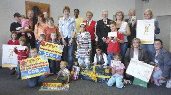 Bürgermeister Klaus Müller (mit Babysimulator), Vetreterinnen der Frauenunion Iserlohn, Lisa Deus und Melanie Kramm (Schülerinnen der 8 b der Realschule am Bömberg) mit ihrer Lehrerin Dorothee Winter-Lehmann, Friedhelm Kowalski (Ressortleiter Soziales, Jugend, Schule, Sport) und Dr. Ulrich Bildheim bei der Spendenübergabe im Iserlohner Rathaus