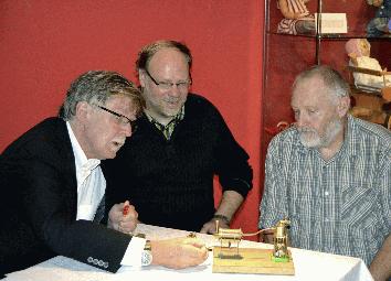 Von links: Wolfgang Rasmussen und Norbert Witte überreichten einen Originalbogen mit zwanzig Sondermarken an Bürgermeister Dr. Peter Paul Ahrens.