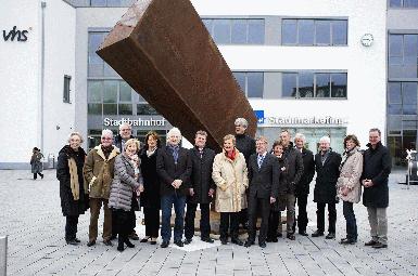 Mitarbeiter des städtischen Kinder- und Jugendbüros, der Abteilung Stadterneuerung und des Quartiersbüros stellten gemeinsam mit dem Künstler Fritz Pietz aus Dülmen (3. v.r.) und den an der Sommerferien-Aktion beteiligten Kindern die neue Skulptur für das Grundstück Friedrichstraße 64 vor, die die bunte Vielfalt des Quartiers Südliche Innenstadt / Oberen Mühle symbolisiert.