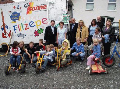 Kita-Leiterin Kerstin Helmering (l. mit Kita-Kind Julia Kranich), Freddy Klahold, Peter Martin und Kita-Kind Amalia Hageböck (v.l.) bei der offiziellen Übergabe der neuen Spielzeuge.
