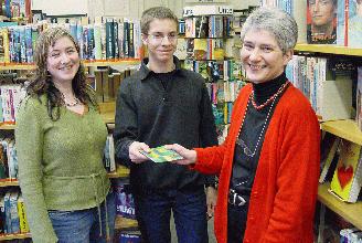 Büchereileiterin Christa Volkmann (rechts) und ihre Mitarbeiterin Sandra Bogdanski "belohnten" Dennis de Coster für seinen Ausleiherekord mit einem Bücher-Gutschein.