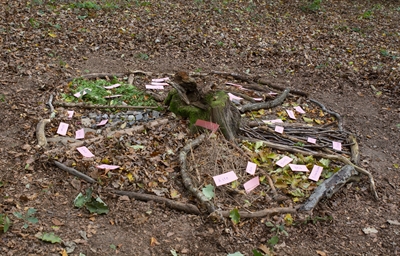 Unter Anleitung der Naturpädagogen sammelten die Kinder zum Beispiel kleine Steine, Zweige oder Blätter und legten sie in die einzelnen Abschnitte ihrer “Waldpizza”. Auf kleine Zettel wurden die Namen oder Eigenschaften der “Zutaten” geschrieben und ihnen zugeordnet.