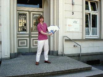 VHS-Leiterin Lieselotte Berthold, Bürgermeister Dr. Peter Paul Ahrens und Manfred Schäfer, Sparkassen-Vorstand, bei der symbolischen Scheck-Übergabe.