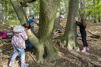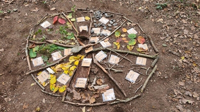 Unter Anleitung der Naturpädagogen sammelten die Kinder zum Beispiel kleine Steine, Zweige oder Blätter und legten sie in die einzelnen Abschnitte ihrer “Waldpizza”. Auf kleine Zettel wurden die Namen oder Eigenschaften der “Zutaten” geschrieben und ihnen zugeordnet.