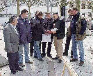 Grünflächenplaner Ingo Genster, Stadtbaurat Mike-Sebastian Janke, Medienreferentin Christine Schulte-Hofmann und die Vertreter der Baufirma Leci (von links) erläuterten nach der offiziellen Freigabe des Spielplatzes die noch anstehenden Arbeiten zur Umgestaltung des Fritz-Kühn-Platzes.