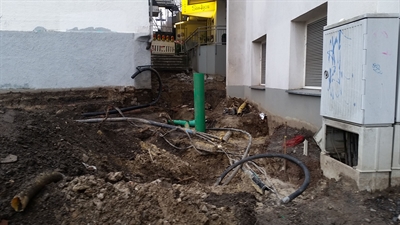 Katrin Brenner und Heiner Steingrefer vom Kommunalen Immobilien Management der Stadt Iserlohn lassen sich die Tiefenbohrung für die Erdsondenanlage erläutern.