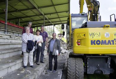 Stellten bei einem Pressegespräch die geplanten Arbeiten vor: KIM-Leiterin Claudia Zawada, Herr dos Santos von der Firma UKA-Bau, die städtische Medienreferentin Christine Schulte-Hofmann, Hermann Noll vom KIM sowie Landschaftsarchitekt Roland Pfeiffer (v. li.).