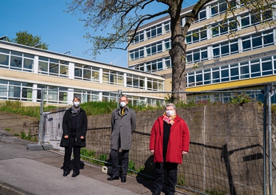 Projektleitern Stephanie Schröder (l.), Stadtbaurat Thorsten Grote und KIM-Leiterin Claudia Zawada vor dem künftigen Ausweichquartier der Stadtverwaltung.