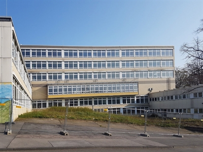 Olaf Pestl, Leiter des Ressorts Planen, Bauen, Umwelt- und Klimaschutz (l.), und Objektbetreuer Hermann Noll vom Kommunalen Immobilien Management erläuterten bei einem Pressetermin den Stand beim Um- und Ausbau der ehemaligen Hauptschule Brüderstraße.