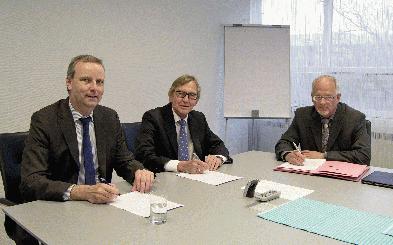 Dr. Ulrich Bergmann, Geschäftsführer der Stadtwerke Iserlohn GmbH, Finanzdezernent Harald Drees und Bürgermeister Klaus Müller (v.l.n.r.) bei der Unterzeichnung des Vertrages zur Übernahme der technischen Betriebsführung der städtischen Energieanlagen.