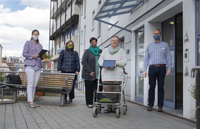 Videotelefonie ist ab sofort im St. Pankratius Altenheim und Pflegezentrum St. Aloysius möglich. Nicole Behlau und Annette Fricke („Continue“), Sozialarbeiterin Anja Schulte, Heimbeiratsvorsitzende Brunhilde Neuhaus und Einrichtungsleiter Arnd Wiegmann (v.l.) freuen sich über den Start des Projektes.