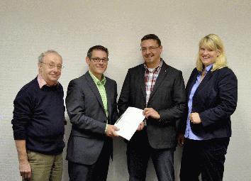 Offizielle Vorstellung des neuen Seniorenbeauftragten der Stadt Iserlohn Thorsten Klein (v.l.): Seniorenbeiratsvorsitzender Holm Roch, Bereichsleiter und „Amtsvorgänger“ Frank Finkeldei überreicht Thorsten Klein den Altenplan, Erste Beigeordnete Katrin Brenner.