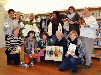 Eine Auswahl ihres Angebotes zum Letmather Weihnachtsmarkt stellten Büchereileiterin Christa Volkmann (stehend, 3.v.l.) und die beteiligten Künstlerinnen bei einem Pressetermin in der Bücherei-Zweigstelle im Haus Letmathe vor.