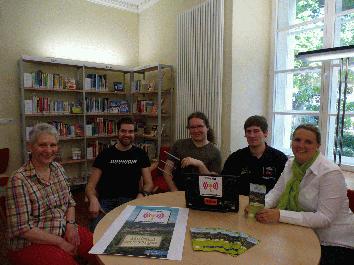 Bücherei-Zweigstellenleiterin Christa Volkmann, Jonathan Lobe (Bereich EDV der Stadt Iserlohn), Jonas Pöhler und Julian Bogdanski (beide Freifunk Iserlohn) sowie Daniela Kunert (Stadtwerke Iserlohn) starteten das erste freie WLAN für Letmathe.