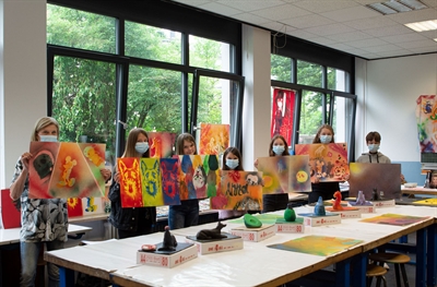 Bei einem Pressetermin warben Veranstalter und Schüler des Berufskollegs des Märkischen Kreises für die Jugendschutz-Party am 28. März im Burgkeller der Schauburg. Die Schüler der Abteilung Gestaltung stellten zudem Beispiele für die während der Party geplante Porträt-Aktion vor.