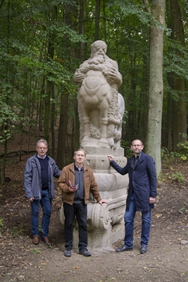 Ingo Genster und Volker Lauterbach von der Abteilung Stadterneuerung und Freiraumplanung und Stadtbaurat Thorsten Grote (v.l.) an einem der beiden restaurierten Zentauren in der Parkanlage Rupenteich im Stadtwald.